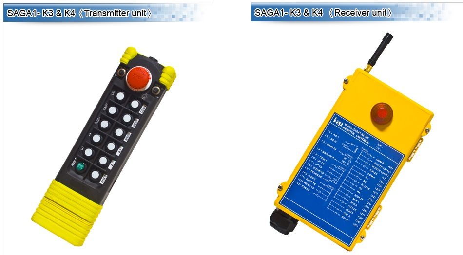 Tienen características únicas pendientes, alternativas en la programación simplemente configurar en el software PC solicitó la grúa de carga más pesada y equipos. SAGA1-K3: 12 de un solo paso pulsadores + A / B Control + EMS + botón giratorio Key + alarma (bocina)
