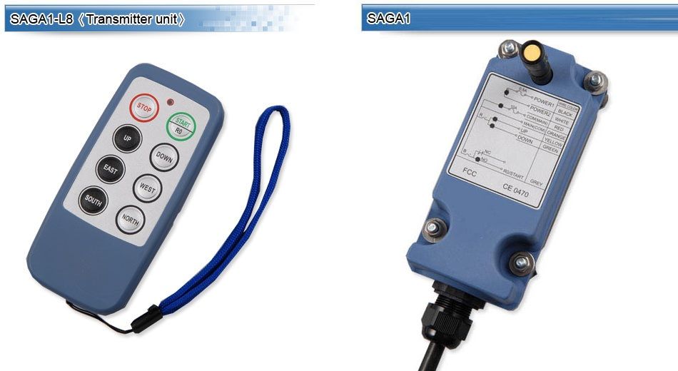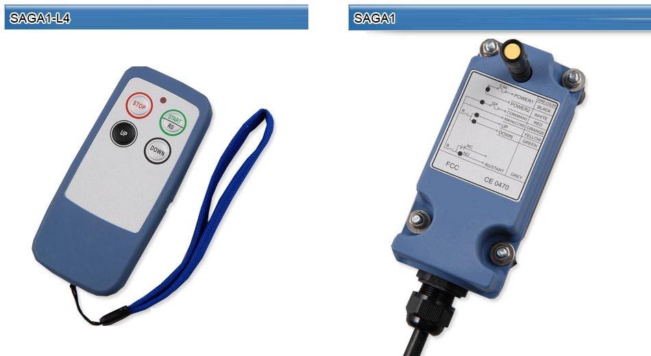 Un pequeño transmisor compacto de bolsillo, cumplido plenamente los mecanismos de la seguridad. Un monomando Simple y sencillo con el receptor conjunto. Su principal mercado suele ser el de pequeñas grúas polipastos de un solo recorrido y manos para de vehículos, especialmente para los camiones de remolque. SAGA1-L4: 4 pulsadores (Inicio, Detener, Arriba, Abajo)